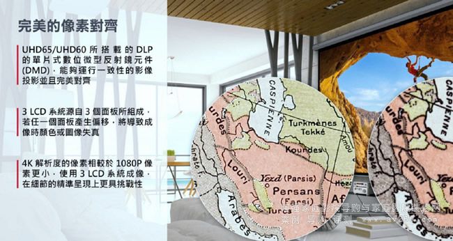 另一方面,即使是真實(shí)4K解析度的液晶投影機(jī),由于必須做RGB三塊面板的像素對齊,不容易達(dá)到UHD65及UHD60這樣僅使用單片DMD顯像晶片,所有像素絕對對齊的精細(xì)度。