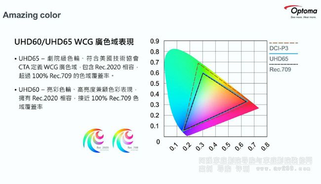 UHD65使用RGBRGB劇院級(jí)色輪,光輸出強(qiáng)度為2,200 ANSI流明,色域范圍涵蓋100% Rec.709,也對應(yīng)Rec.2020。另一部UHD60則使用亮彩色輪來兼顧高亮度與色彩表現(xiàn),同樣對應(yīng)Rec.2020,色域涵蓋度接近100%的Rec.709色域范圍,光輸出強(qiáng)度則為3,000 ANSI流明。
