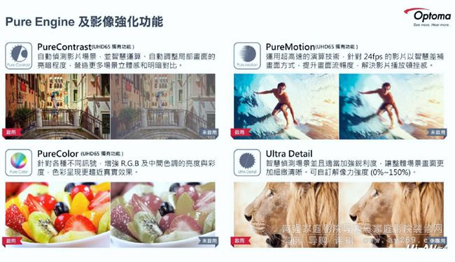 UHD65及UHD60都配備Ultra Detail智慧場景銳利度增強(qiáng)功能,UHD65另外還有PureContrast、PureColor與PureMotion等影像增強(qiáng)優(yōu)化技術(shù),能強(qiáng)化場景立體感與明暗對比、增強(qiáng)RGB三原色及中間色調(diào)的亮度與彩度、提升動(dòng)態(tài)畫面影像的流暢度。
