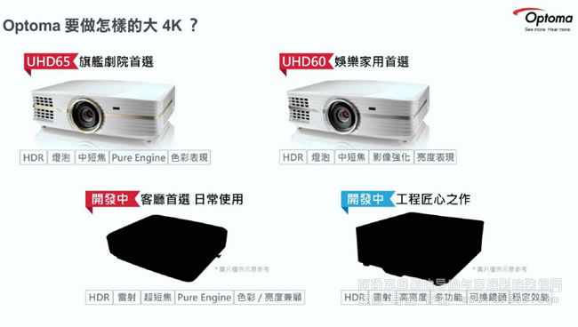 除了UHD65及UHD60,Optoma還有使用雷射光源的4K投影機(jī)正積極開發(fā)中,包括適合使用在客廳的超短焦投射機(jī)種,以及高亮度、可更換鏡頭的家庭劇院投影機(jī),實(shí)在讓人期待!
