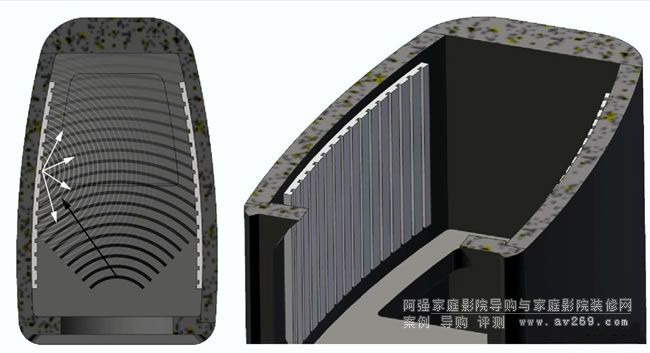 從外表看不出來Contour 60喇叭的弧形音箱有多厚,但其實它遠超過一般喇叭的音箱厚度,這也是其單支重量就達54.3公斤的原因。Contour 60音箱背板厚度為38mm、前障板為26mm,就連側板也厚達19mm,更于內部貼覆由KERF技術精準切割的減震板,藉以打散音箱內的聲波反射(如上圖所示)。超厚實的音箱不僅可提供單體穩固的發聲基礎,也可抑制音箱震動多馀的噪音污染,讓Contour 60能展露磅礡的大喇叭氣勢,又可重現微小的音樂細節與律動,傳達生動的表情與情感。