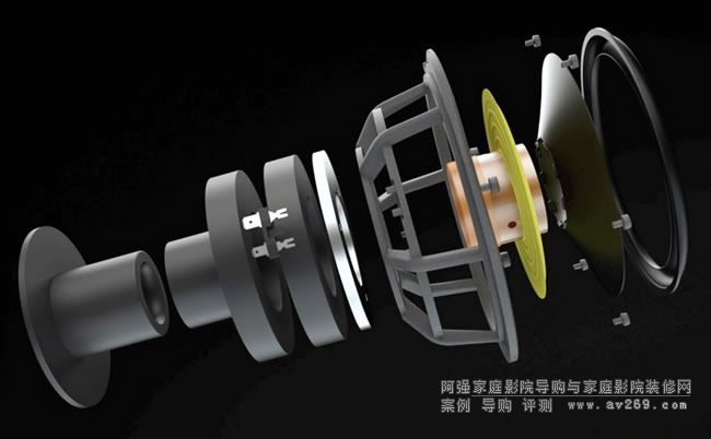 Contour 60所配備之15M38中音及24W65低音單體都是全新開發的,上面就是新中低音單體的結構分解圖,看似跟一般的喇叭單體沒有太大差別,但事實上 Dynaudio透過新的FEM有限元素分析等電腦設備之輔助,更改了懸邊的設計、採用玻璃纖維音圈套筒、也讓彈波的每一圈寬度漸次變化,結果使得錐盆前后運動的衝程比舊款Contour整整增加了70%。