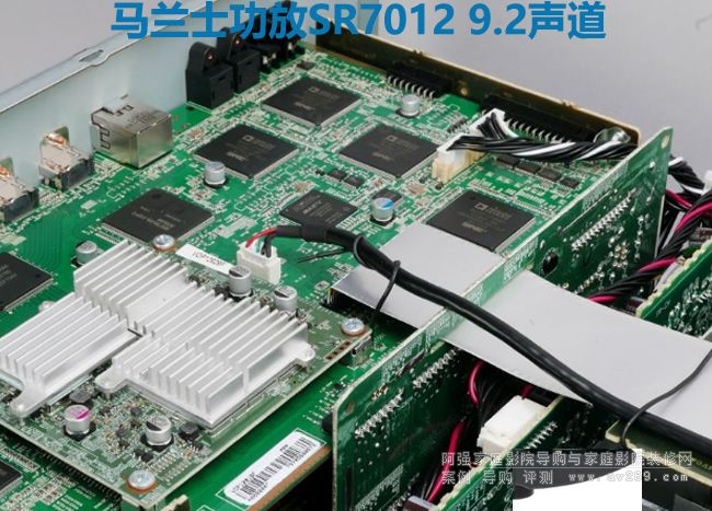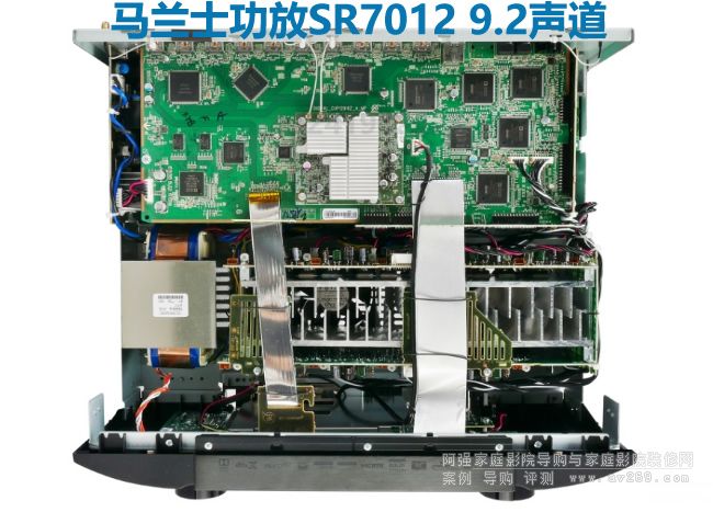 SR7012各部電路配置的方式與多數環繞擴大機近似,環繞解碼前級在后、9聲道功放電路在前。數位主板位于前級電路的最上方,專為音樂串流製作的HEOS無線模組裝在數位電路主板的中央位置,多聲道音訊處理配備4枚Analog Devices SHARC DSP晶片「ADSP21487」,以強大的運算效能作多聲道解碼與Audyssey最高等級的MultEQ XT32高精度等化處理。