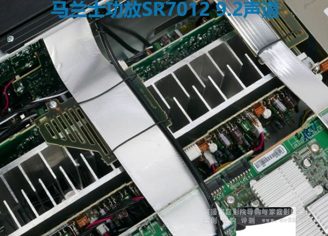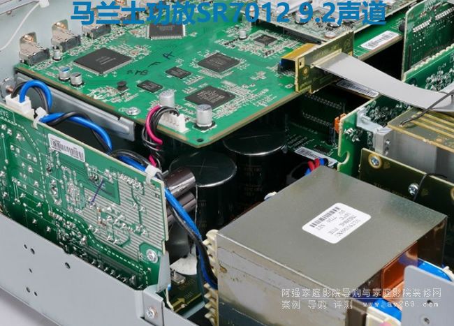 先看本機的機內俯視圖,SR7012把電源電路配置最機內的最左側,機箱內的后半部是環繞解碼前級部分,9聲道AB類功率放大電路則在前半部、分成前后兩塊(前面4聲道、后面五聲道)。