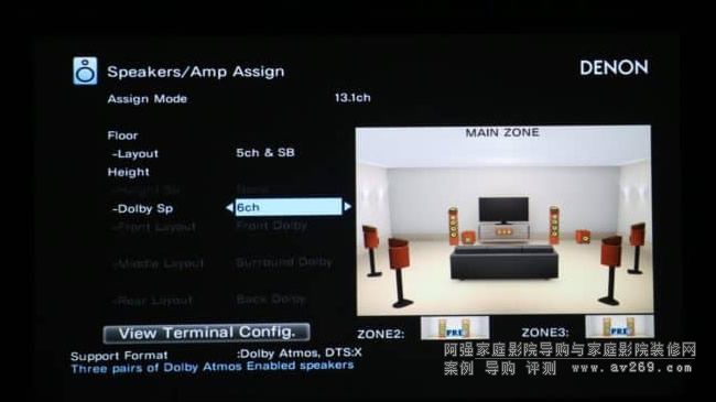 ▲ 預載 Dolby Atmos 及 DTS:X 解碼及 13 組獨立擴音線路,并可透過韌體更新支持 Auro3D。