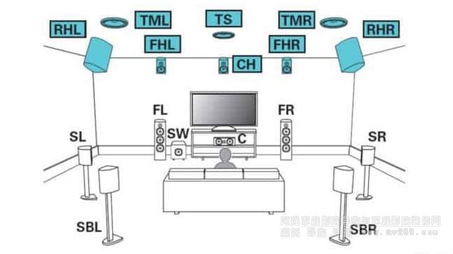 ▲ 透過韌體更新支援 Auro3D 之后,有足夠數目喇叭及空間的用家,就可以預先連接上中置(圖中的「CH」喇叭)、VOD 喇叭(圖中的「TS」喇叭)及一對天花高空喇叭(圖中的「TML」及「TMR」喇叭),再由擴音機因應音效解碼自動切換驅動之喇叭。