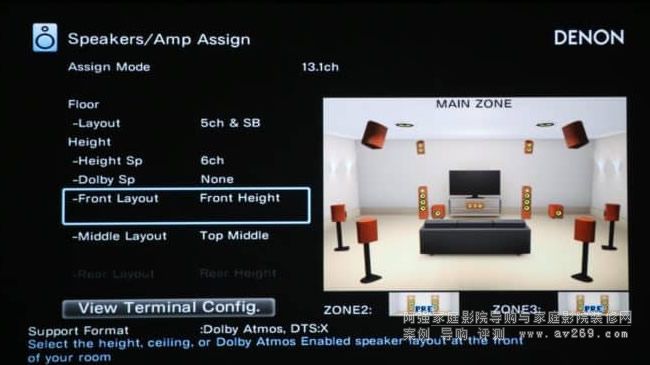 除內置 13 組獨立擴音線路外,AVC-X8500C 更配備 15 組喇叭接柱,除可連接 9.2.4 或 7.2.6 喇叭架構去輸出 Dolby Atmos/DTS:X 環繞聲系統之外,也可同時預先接駁聆聽位置頂方的一對高空天花喇叭,以及上中置(Center Height)及「上帝之聲」(Voice Of God﹐簡稱 VOD),讓擴音機在更新支援 Auro3D 之后,可以因應輸出的環繞聲,從 7.2.6 及 13.2(第一層 7.2 聲道,第二層 5 聲道,第三層單聲道 VOD) 兩種截然不同的環繞聲架構中自行切換驅動之喇叭,十分用心。另外,AVC-X8500C 亦搭載 15.2 Pre-Out 輸出端子,可讓發燒級玩家配合獨立后級擴音機去驅動喇叭。