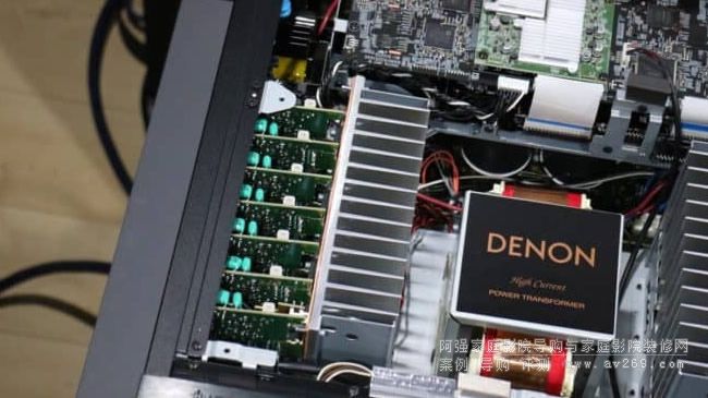 在內部用料上,Denon 採用核心面積達 111 x 90、重量至 8.2kg 的大型 EI 變壓器,配以一對定制式 22,000μF 電容,為整部擴音機提供更穩定的供電,去應付高動態瞬變的環繞聲。另外,13 組獨立擴音線路的線路板加入了 2mm 厚的銅板、4 把底置散熱風扇及加厚散熱板,并更改每組擴音晶體管的排列架構,確保所有擴音線路可以更穩定地運作。