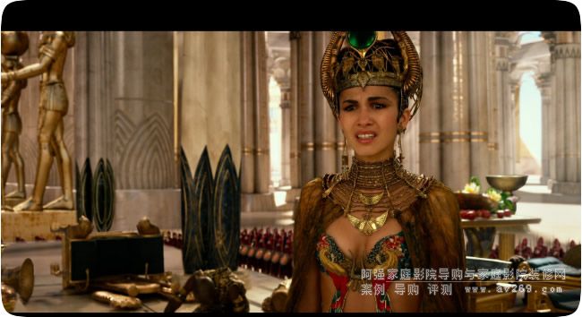 其次,2500000:1的高對比度讓CH-LS100對于畫面層次感、尤其是暗部細節的還原有很好的幫助,黑色能沉下去且不會因為高亮度呈現發灰的情況。比如上圖《神戰:權力之眼》里竊賊貝克在地下寶庫中偷取荷魯斯神之眼的場景中,CH-LS100就很好地展現了暗部場景的細節,這是可是很多投影機無法達到的;