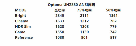 激光-磷光體光引擎旨在延長投影機的使用壽命。Optoma對機器光引擎的標稱壽命為全亮度模式下20000小時,并表示在較低的功耗設置下UHZ880應該能持續更長的時間。