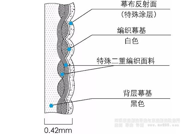 HDR呢?這項(xiàng)技術(shù)叫做高動(dòng)態(tài)對(duì)比,原本是讓畫(huà)面亮的地方更亮,暗的地方更暗。那么為了讓投影機(jī)的亮度更亮,在HF102這塊幕布上,就有一層非常細(xì)密的玻珠涂層,這個(gè)涂層會(huì)將投影機(jī)的光線匯聚,反射到觀看者的眼部,從而使畫(huà)面有一個(gè)非常高的增益,直觀來(lái)說(shuō)畫(huà)面就會(huì)變得很亮。而暗部的體現(xiàn),據(jù)廠家的介紹,一個(gè)方面是幕布本身有一層玻珠能夠讓幕布有回歸幕布的屬性,避免一些雜光的干擾。另一方面因?yàn)槟徊际荳F302這種材料編織的,對(duì)色彩的表現(xiàn)也有提升,再就是透過(guò)幕布后還有一層黑色底層,可以吸收掉雜光,從而讓HDR的黑也能展現(xiàn)出來(lái)。因此把它稱(chēng)之為HDR幕布,具體的表現(xiàn)下文中有屏攝參考。阿強(qiáng)家庭影院導(dǎo)購(gòu)網(wǎng)