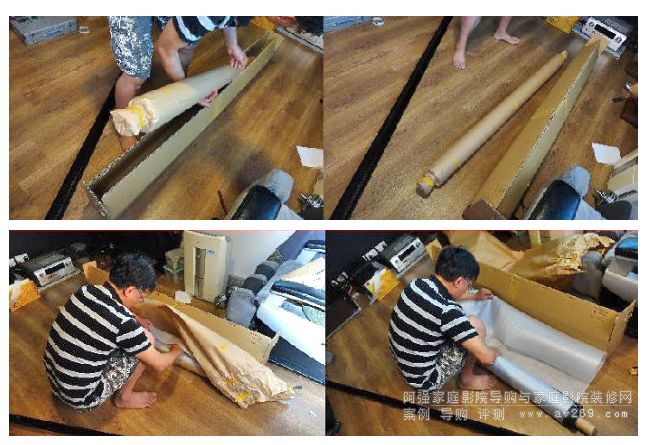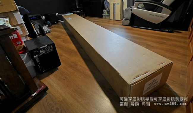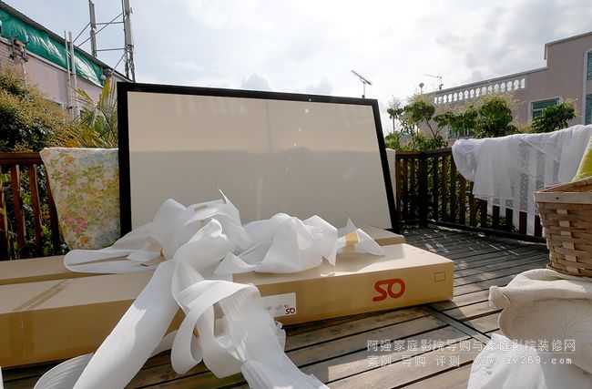 這是 OS 120英寸 16:9  BU 201 2.7 增益固定式投影幕,由于當(dāng)日沒空安裝,只能暫放一邊,幸好 Brian 是住獨(dú)立屋,容許整箱以一柱擎天式直立擺放,把她暫存放于一樓與二樓之間梯級轉(zhuǎn)角處過一晚。