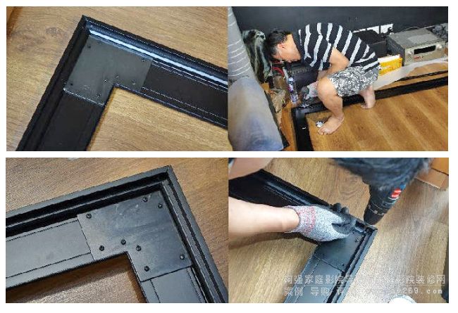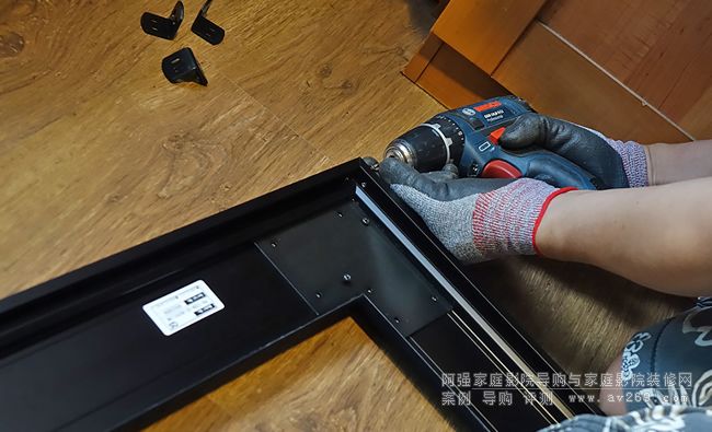 當(dāng)中所見的兩條黑色角鐵,就是用作固定投影幕配件,起手式也是把她裝到墻身,3M 防滑觸感手套是必需工具之一。