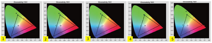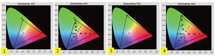 圖3:動畫模式的色域范圍甚至比影院模式還要大,不過在青色、黃色部分出現了偏藍與偏紅的現象,而整體色彩亮度也屬于均衡類型