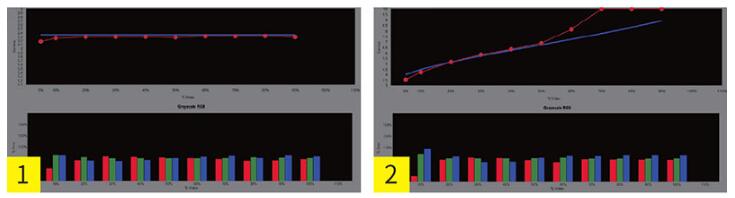圖1:在SDR(非HDR)狀態下測試并調校畫面的Gamma與灰階白平衡,由最后的測試結果可以看到Gamma數值在整段灰階狀態下由始至終都相當平穩,大概維持在2.3左右的水平,而白平衡方面在整段灰階都控制得相當不錯