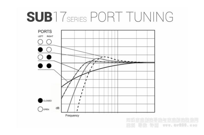 這款SUB10.17低音炮提供通過低音炮后部的開關式可調節均衡器來調節音效。EQ REF能提供最深沉的低音,EQ1能阻斷最低的頻率使聲音在狹小的房間內增強空間感,EQ2能將擊打低音提升為鏗鏘低音。此外,這款低音炮還能使用為低音反射管提供的塞子來調節音效。當兩個塞子都密閉時,10.17低音炮就像一個精準的全密閉盒子,同時能發出an earlier sloping bass。