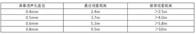 商業影院銀幕的透聲孔大小,主要有0.8mm、1.0mm和1.2mm等幾種規格,一般需要離開屏幕最少10米以外觀看,顯然這樣的銀幕不能用于家庭影院,誰都不希望漂亮的女主角臉部特寫是一臉麻子……于是,開孔直徑更小的微孔透聲幕誕生了。目前市售的適合家用的微孔幕有0.4mm、0.5mm、0.6mm幾種,經過投影測試,并且把一般用于影院VIP小廳的0.8mm微孔幕加入測試,得到最近觀看距離推薦如下: