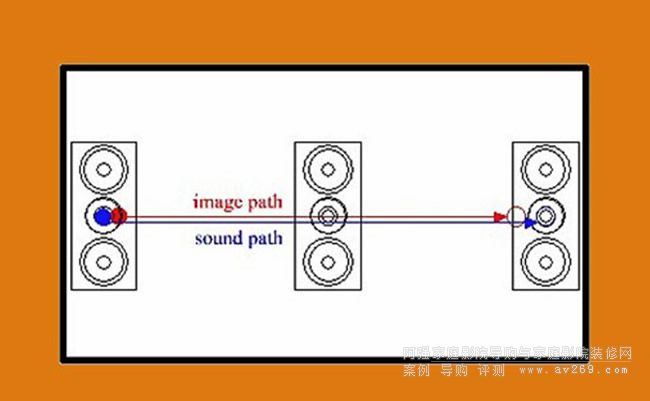 上圖是一般配備大尺寸投影銀幕前方三聲道喇叭的配置,左右聲道配置在銀幕左右兩側,而中央聲道喇叭通常擺放在銀幕下方.假設電影劇情里有一部跑車由左而右疾駛而過,我們視覺上看到的是銀幕上紅線由左到右的直線移動,但同時耳朵所聽見的移動路徑卻是下方的藍色曲線,由於中央聲道放在銀幕下方,因此聲音會先向下偏移、到中央聲道時達到最低點,之後再往上移動到畫面中央高度.盡管將中央聲道向上投射,或者運用環繞擴大機的「嘴型同步」(Lip Sync)等功能可將偏移的距離縮短,但改善效益畢竟很難達到百分之百.