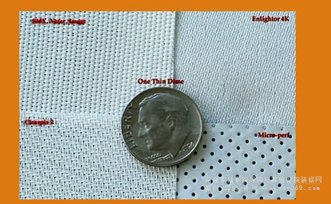 然而,大多數透聲銀幕是在銀幕上「打洞」達到透聲的目的,而其中較平價者并無法達到非常細密的孔洞制作(少數高價制品才作得到),以上圖右下角的平價透聲銀幕而言,大口徑的孔洞將會影響到畫面的清晰度及亮度,而聲波也無法有均勻的穿透表現.至於同樣是編織方式的銀幕材質,右上角Screen Excellence的Enlightor 4K銀幕,就明顯比左上與左下的編織銀幕細膩許多,這也是Screen Excellence可達到對應4K2K高解析度的原因.當然,這有賴於更精密先進的技術為後盾,據宏業國際朱老板表示,Screen Excellence是知名法國銀幕品牌Screen Research的老板到英國所設立的另一品牌,難怪能有過人的細密編織銀幕技術.