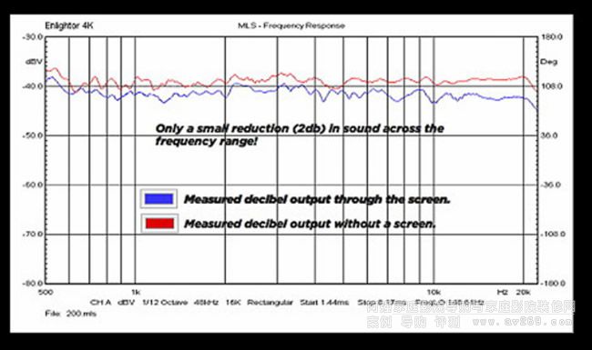 上圖是Screen Excellence原廠所公布Enlightor 4K透聲銀幕的量測曲線,紅色部分是沒有銀幕遮蔽、對喇叭發聲直接兩側的頻率響應曲線,在喇叭前面加上一面Screen Excellence的Enlightor 4K透聲銀幕再作量測,所得到的曲線以藍色顯示.觀察重點是紅藍兩條曲線上下起伏的轉折,從500Hz到20kHz以上都相當近似,只是藍色在各頻率的音壓比紅色略低2.5dB左右,這表示Screen Excellence這面Enlightor 4K透聲銀幕對全頻段的聲頻都沒有明顯扭曲.講得更明白一點,用了Screen Excellence的Enlightor 4K透聲銀幕,幾乎完全不會影響到原有喇叭的音色及聽感,只需將擴大機音量輸出加大2.5dB即可!