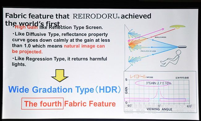 現(xiàn)場簡報強(qiáng)調(diào),這種第四種銀幕技術(shù)是Wide Gradation Type(廣階調(diào)型),能展現(xiàn)HDR的明暗對比效果。