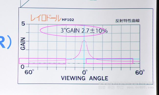 「廣階調(diào)型」,它成功結(jié)合了「擴(kuò)散型」WF302和「回歸型」BU-201的特點,它以類似WF302的編織層作底,雙層不規(guī)則編織,表面則是有類似BU-201的超微細(xì)玻璃珠。它的最高增益值也達(dá)到2.7,但是這個2.7的可視角度極小,只有±3度的范圍,為何這么小呢?因為高增益并不是它唯一的目的,HF102的設(shè)計并不是要復(fù)制一款增益2.7的銀幕(這個效果BU-201已經(jīng)達(dá)到了),而是要「拉大對比度」。