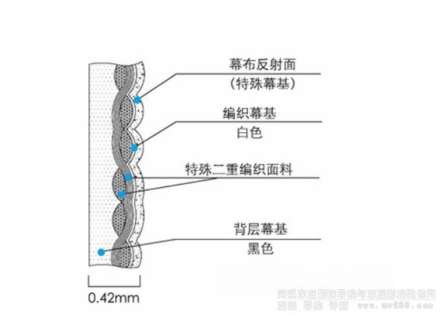 這就是幕面的結(jié)構(gòu)圖。大家可以看到結(jié)構(gòu)頗為複雜,基底為雙層隨機(jī)編織(不像某些平價產(chǎn)品為單層編織)。而且現(xiàn)場人員還表示,OS的銀幕加上微珠之后,表面還會再做涂層,以維持幕面的穩(wěn)定,所以不會像市面上有些珠光幕會有「掉珠」的現(xiàn)象。