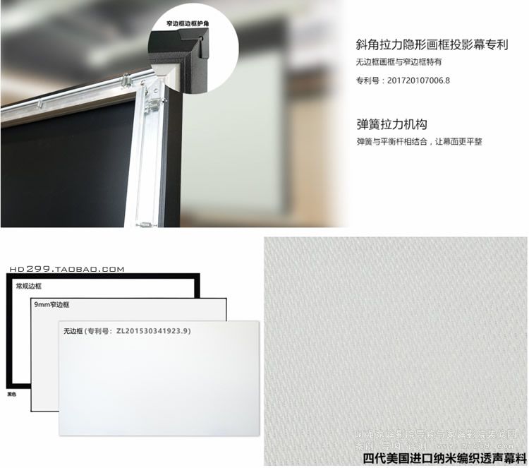 投影幕料:第四代美國納米高清ND編織透聲幕 外殼用料:常規(guī)邊框/9mm窄邊框/隱框 投影尺寸:72-200英寸(常規(guī)畫框最大做到250寸) 可視角度:160° 增益倍數(shù):1.0