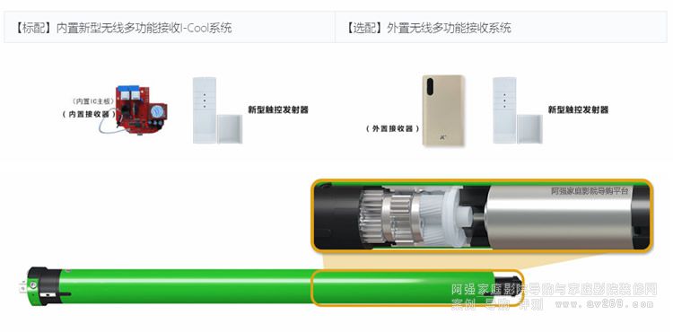 默認采用內置遙控器,無線接收器安裝在電動投影幕里面,用無線發射器控制投影幕升降,讓投影幕看起來整體,更簡約美觀;而外置遙控系統則接在投影幕外面與電源線連在一起,用無線發射器控制投影幕升降。