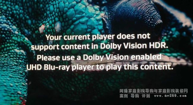 平時大家購買得到的 Dolby Vision 4K UHD BD,在連接只支持顯示 HDR 10 的顯示器時,都會自動轉為 HDR 10 訊號輸出。但這次的《Dolby UHD Blu-ray Demo Disc/Mar 2018》則有點不同,當 4K UHD BD 播放器或顯示設備不支持 Dolby Vision 時,畫面就會以英文顯示「你使用中的播放器不支持 Dolby Vision HDR」,同時語音提示你的功放并非輸出著 Dolby Atmos 音效,亦即代表所有內容均為純 Dolby Vision 格式,不會轉換成 HDR 10,如不是所有裝置都兼容 Dolby Vision,你是完全無法觀看這張示范碟的!也是因為這個原因,不論閣下使用的是那一個品牌的投影機,當下也是不能以大畫面欣賞的。
