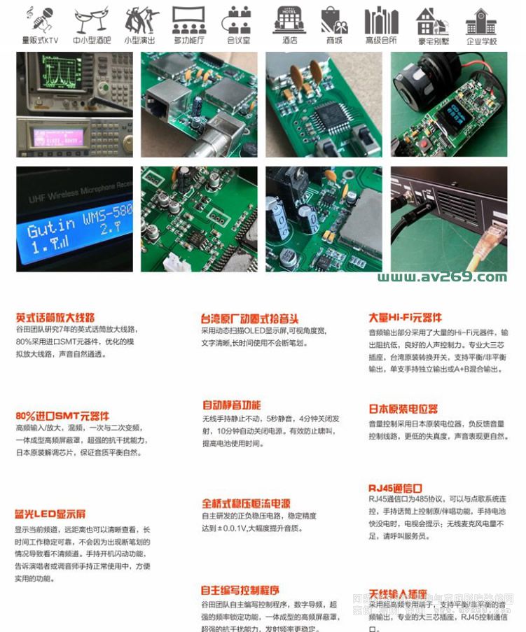 內置了專業的防嘯叫處理芯片,可能較長距離話筒演唱,大動態不失真!