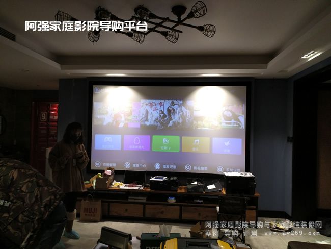 接下來安裝投影機和環繞音箱,這款投影機是不是很特別?他就是現在互聯網熱門品牌極米的投影機,這是業主朋友送的,不想浪費先頂上后期再升級,這可難為我們了,做為互聯網投影品牌,在做應用場景設計的時候應該沒有考慮到這種準專業的家庭影院擺位和安裝方式。