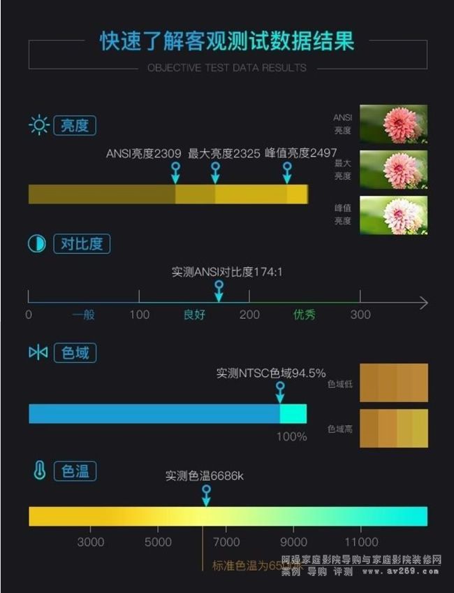 ANSI亮度指的就是按照ANSI測試標準。正因如此,ANSI亮度參考意義更大。實測顯示,根據ANSI測試標準,明基X12000H高端家庭影院投影機的ANSI亮度達到了2309ANSI流明,同樣超過了標稱值,同時這樣的ANSI亮度表現也可以給用戶帶來更好的觀影體驗。www.2008wb.com