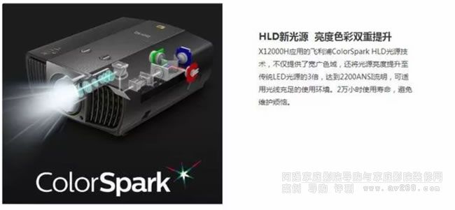 X12000H應用的飛利浦ColorSpark HLD光源技術,不僅提供了寬廣色域,還將光源亮度提升至傳統LED光源的3倍,達到2200ANSI流明,可適用光線充足的使用環境。2萬小時使用壽命。