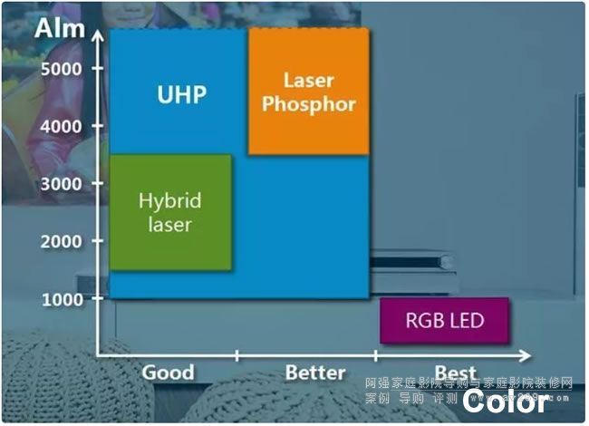 上圖反應了光源在投影機應用中的特性,豎著的座標是亮度,橫著的是色彩。大家可以明顯看到激光光源在提升亮度上更有優勢,而LED光源有更好的色彩表現,但亮度不佳。早期的高端LED家用投影機,亮度也就在1100流明上下。現在X12000H的2200流明,確實在家用投影機中不算高,但確實對于LED光源來講,也算不錯了。