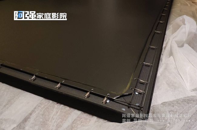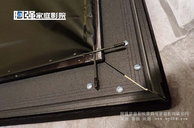幕布組裝完成,彈簧和幕布的張力匹配完美,幕面非常平整。剩下的就是上墻,screenlion畫(huà)框幕布帶有專用安裝支架,常用掛鉤的方式固定到墻上,幕布框上有固定口,輕松掛上即可,如果幕布不垂直或者有晃動(dòng),可以在下框也固定一下,專用配件阿強(qiáng)在安裝的時(shí)候沒(méi)有拍上照片,后期再給朋友們補(bǔ)上!