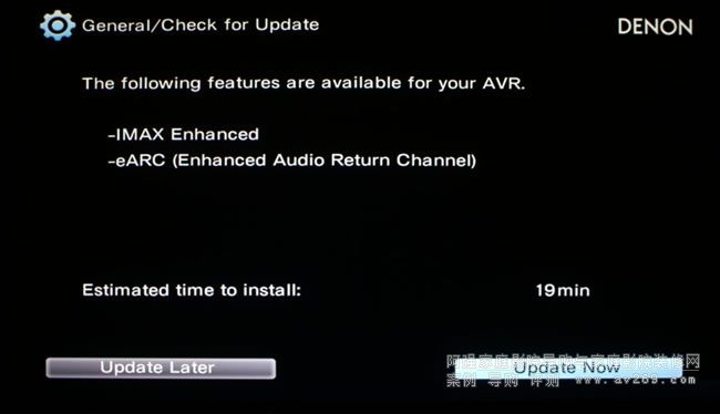 在本站視聽室裡的Denon AVR-X8500H,于10月31日收到韌體更新通知訊息,點開一瞧就發(fā)現(xiàn)是對應(yīng)IMAX Enhanced的韌體更新,此次還附帶有eARC(Enhanced Audio Return Channel)功能之對應(yīng),可針對Dolby Atmos及DTS:X等「物件導(dǎo)向」環(huán)繞音效音訊回傳,讓電視或Sounbar對應(yīng)解碼播放。此次韌體更新安裝預(yù)估需要19分鐘左右。