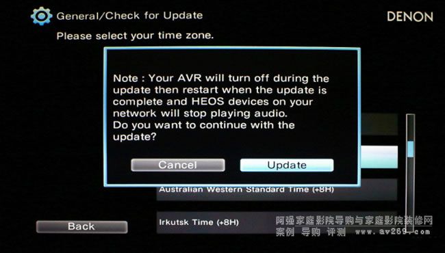 按下前一個畫面的「Update Now」(立即更新)并選擇所在時區(qū)之后,會出現(xiàn)上面這個說明視窗,提醒Denon AVR-X8500H在更新過程裡將會關(guān)閉畫面并在更新完成后重新開機,而且所有透過本機網(wǎng)路連結(jié)的HEOS多室音樂播放器材將會中斷音樂播放,再次詢問是否確實要執(zhí)行此次韌體更新。