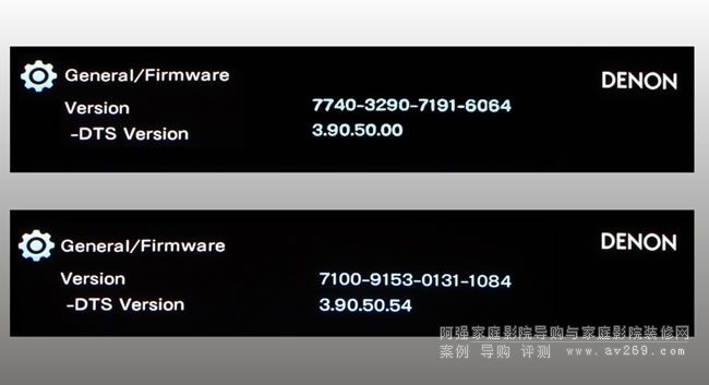 韌體更新完成后Denon AVR-X8500H會再次重新開機,進(jìn)入設(shè)定選單的韌體資訊畫面,就可看到韌體版本的變化。上圖上半部及下半部分別是此次韌體更新前與韌體更新后,所分別顯示的本機韌體版本編號,可以發(fā)現(xiàn)整體版號及DTS音效版本號碼都已經(jīng)改變了。