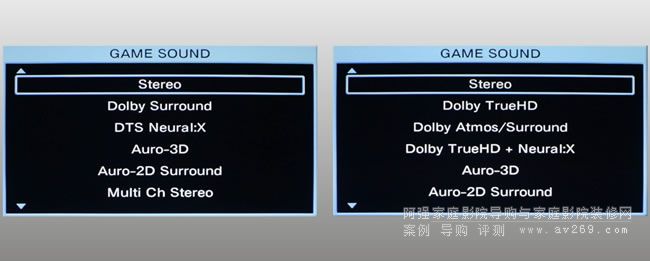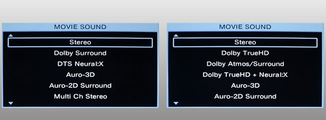 除此之外,在Denon AVR-X8500H沒有音訊輸入狀況下,按下音效模式切換選擇按鍵,可以發(fā)現(xiàn)所顯示的選項有了變化。在「電影模式」(MOVIE SOUND)選單裡,比較韌體更新前(上圖左側(cè))與韌體更新后(上圖右側(cè),以下兩張圖片相同)可發(fā)現(xiàn)原本的「Dolby Surround」音效分為「Dolby TrueHD」與「Dolby Atmos/Surround」兩項,原本能以「純DTS」做更多聲道上轉(zhuǎn)的「DTS Neural:X」不見了,變成在Dolby TrueHD基礎(chǔ)上做DTS Neural:X上轉(zhuǎn)處理的「Dolby TrueHD + Neural:X」格式。