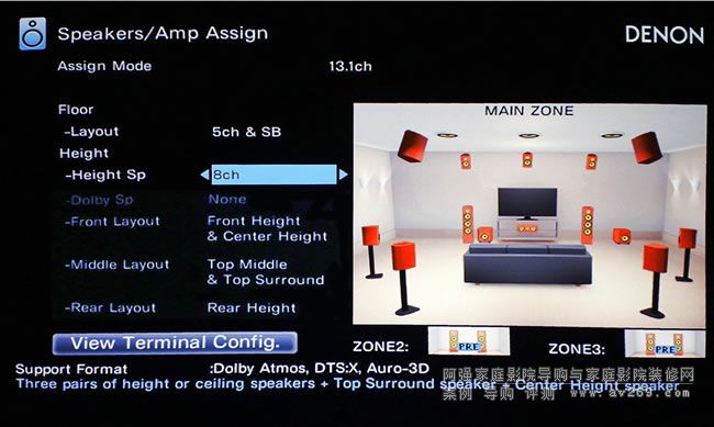 播放Dolby Atmos音效時,則為7.1.6環(huán)繞模式(上方音場有Front Height、Top Middle與Rear Height喇叭各一對)。