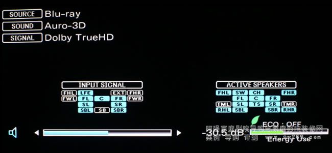 至于在播放Auro-3D音效或?qū)olby TrueHD、DTS-HDMA、LPCM多聲道音效施以Auro-3D上轉(zhuǎn)處理時,則會以Auro-3D 13.1環(huán)繞模式出現(xiàn)(下層有7聲道與超低音,高層有Center Height、Front Height與Rear Height五聲道,頂層則有VOG上帝之聲喇叭)。