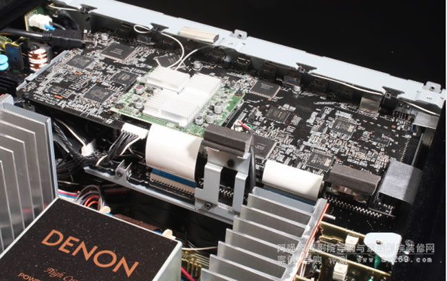 機箱后面三分之一區(qū)塊,類比電源電路在最下方,機箱左后方豎立的是數(shù)位電源電路,在背板中央處有一塊金屬板對下方的類比電源電路做隔離,其上方則是數(shù)位電路主板、數(shù)位類比轉(zhuǎn)換及前級放大電路等三塊獨立電路板,在設(shè)計上Denon AVR-X8500H極力縮短音訊傳輸距離,不僅這三塊電路板上下之間距縮短至不到5公分,數(shù)位類比轉(zhuǎn)換電路板也較前旗艦AVR-X7200WA小得多,類比電路更去除了緩衝電路設(shè)計,讓音頻傳遞更為直接無染、更具速度感及衝擊力。