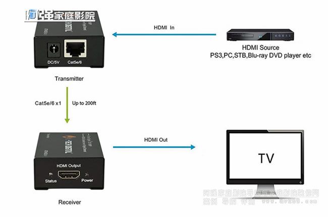 2.把HDMI的信號(hào)端(例如DVD/藍(lán)光播放機(jī)、流媒體中心、各種盒子、游戲機(jī)甚至是一個(gè)AV功放的輸出端)連接到發(fā)射端的輸入端口;