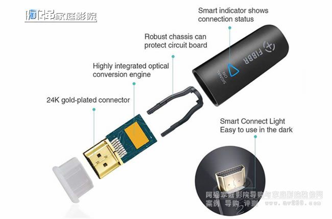 另外還有一種把光纖轉(zhuǎn)換器集成到HDMI接頭內(nèi)部的“有源光纖HDMI線材”。這種線材使用起來跟普通的HDMI線材一樣,即插即用,無需額外供電。一頭接信號(hào)端,一頭接設(shè)備端,插上就可以使用了。