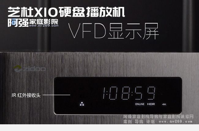 X10配備一塊大尺寸VFD顯示屏,淡藍色的屏顯與冷艷的金屬機身相得益彰,有了這個屏,影片播放時間可一直顯示在屏幕上,主機狀態也可一覽無遺。
