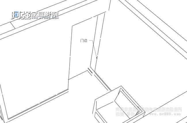 上兩圖分別為結構示意圖和現場圖片,基本上可以了解到入戶門這邊有兩洞口,前墻和側墻有大面積凹槽需要找平處理,可以把體積大的低音炮安置到電視墻,后墻左后方有設備間門,其中有兩扇門的位置很不理想,在這里阿強著重的拿出來說明一下: