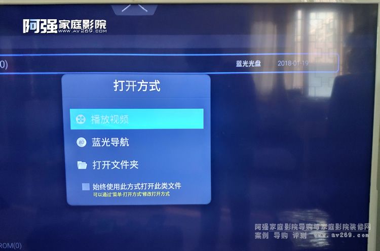 4、30秒左右的讀盤(pán)時(shí)間,播放器為識(shí)別當(dāng)下放的是什么版本的碟片,阿強(qiáng)這里顯示的為“藍(lán)光光盤(pán)”,現(xiàn)在你可以按OK鍵選擇播放模式,有三個(gè)選項(xiàng),很直觀,阿強(qiáng)習(xí)慣性直接播放視頻,具體音軌字幕的選擇直接在大片播放中隨心調(diào)整。(圖四 圖五)