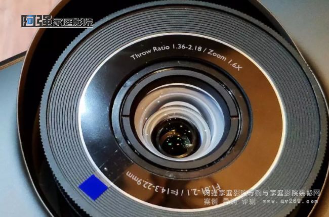 給W5700的1.6倍鏡頭來個(gè)特寫,從鏡頭標(biāo)示參數(shù)可以看到,其投射比 1.36~2.18。從發(fā)布會(huì)上得到的消息也知道,鏡頭是采用了擁有6組11片低色散光學(xué)玻璃鏡頭,因此我對(duì)畫質(zhì)很有期待。而且鏡頭上方獨(dú)具匠心地設(shè)計(jì)了鏡頭防落塵帽檐,簡直是我這般強(qiáng)迫著患者的福音。