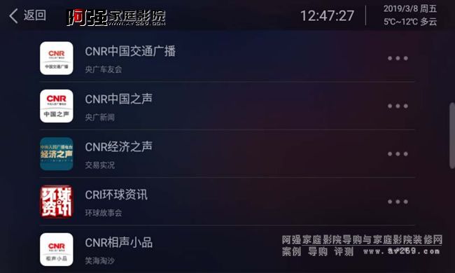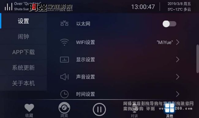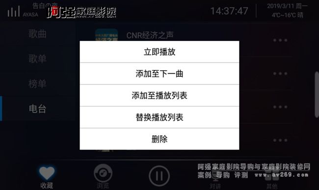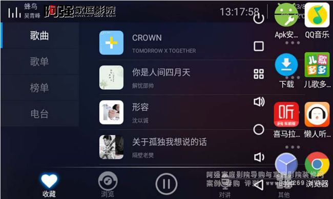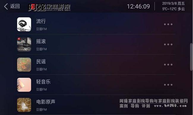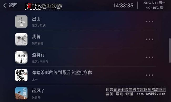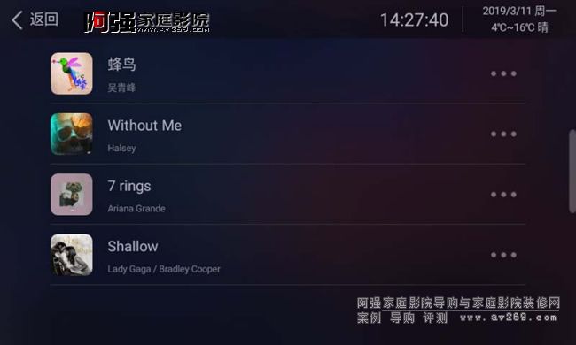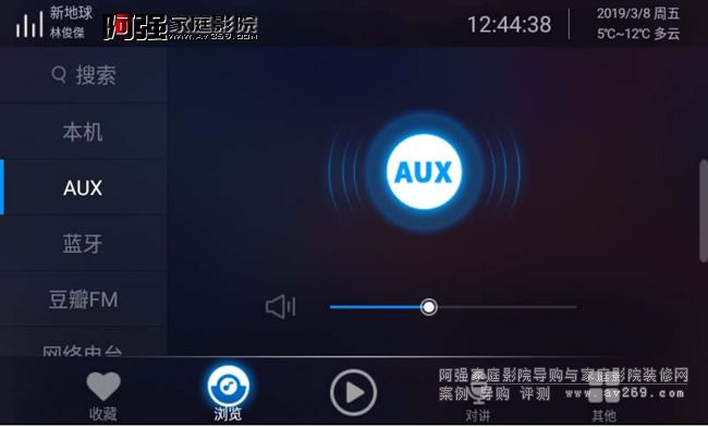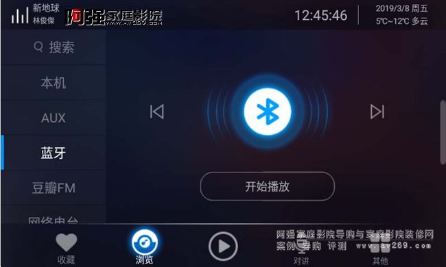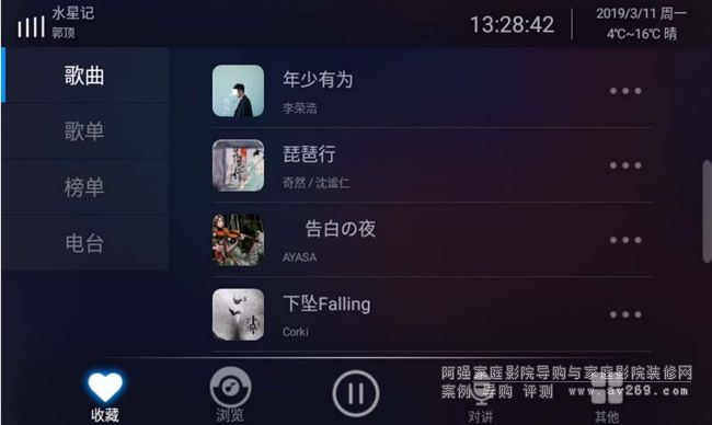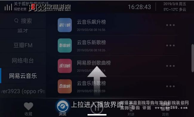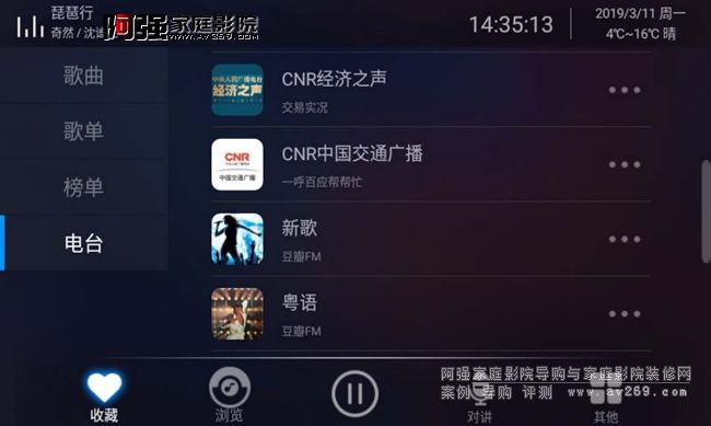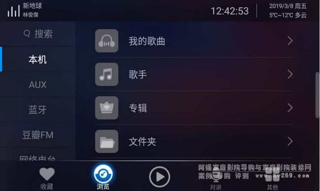 瀏覽界面就是我們要選擇歌曲的播放頁面,左側分別顯示搜索、本機、AUX輸入、藍牙輸入、豆瓣電臺、網絡電臺、網易云音樂。